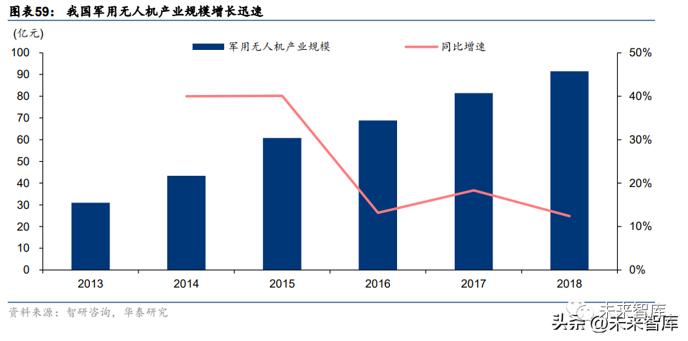 軍用無人機是現代戰爭中的新型作戰力量。軍用無人機一般都具有復雜的操作系統和火控 系統,可以執行超遠距離的偵察、打擊和毀傷等一系列任務。軍用無人機作為現代空中軍 事力量的一員,在現代戰爭中的地位和作用日漸突出。目前,國內軍用無人機市場主要有 三大類型:航天彩虹研制生產的“彩虹”系列無人機、中航工業成飛設計研制的翼龍無人 機、哈飛與北航聯合設計的長鷹 BZK-005 無人機等。
