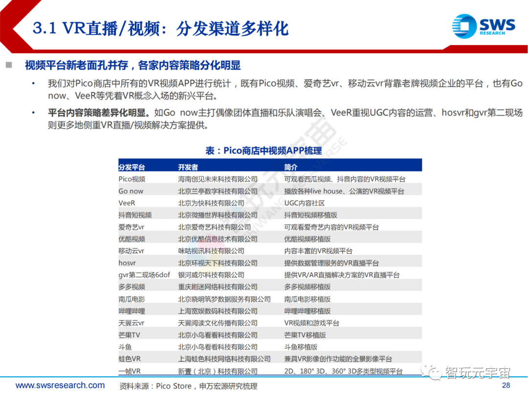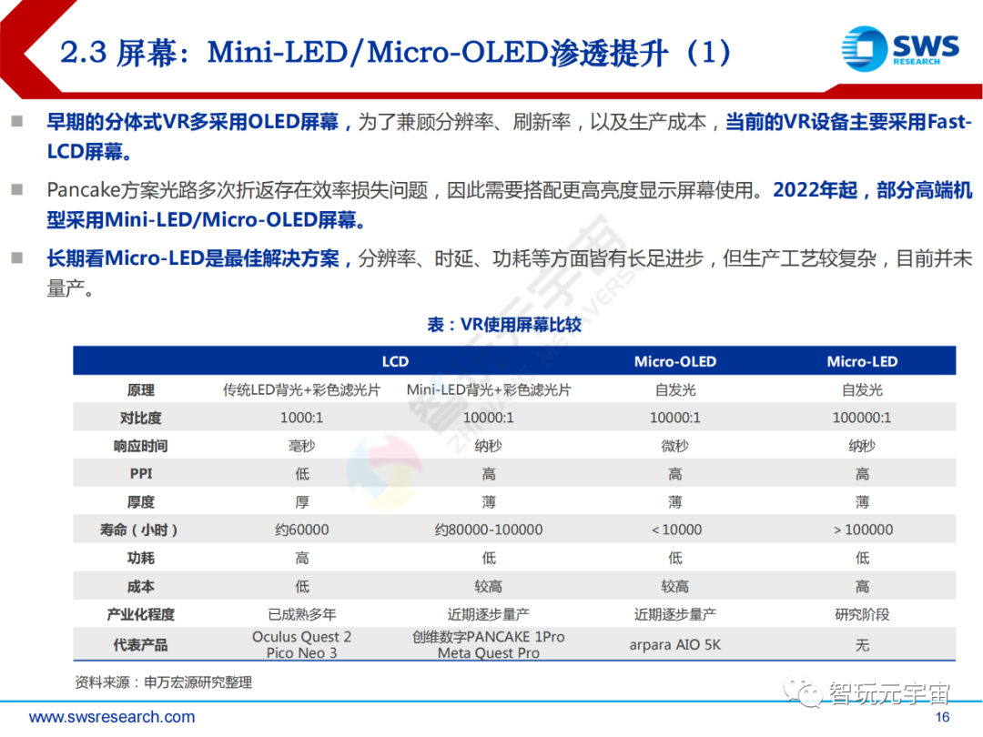 硬件:VR新品密集,光學、屏幕、交互升級。2H22至23年字節、創維、Meta、蘋果、索尼等國內外重點廠商新品密集,硬件主要升級方向在輕薄化和交互增強:Pancake取代菲涅爾透鏡成為主流光學方案;高階版使用亮度更高的Mini-LED屏幕,交互方式增加眼動追蹤、面部識別和全彩VST功能。