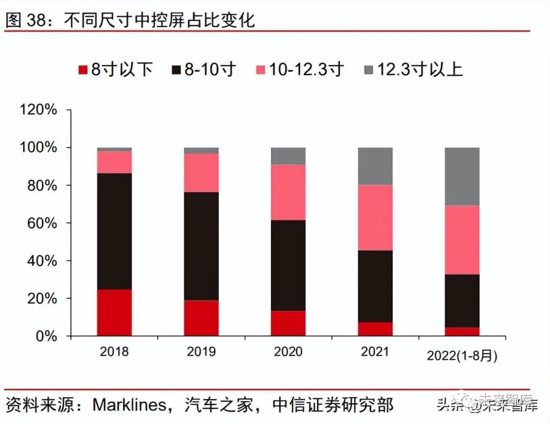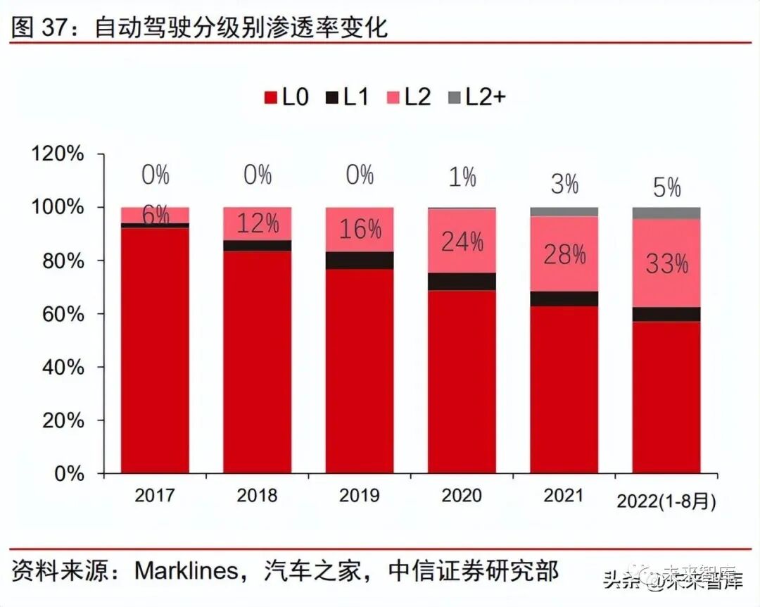 智能網聯不斷發展,核心產品滲透率提升。近年來,智能化、網聯化成為汽車行業發 展趨勢,核心配置滲透率不斷提升。自動駕駛方面,L2/L2+級自動駕駛滲透率由 2017 年 的 5.9%逐步提升至 2022 年 1-8 月的 37.4%,而 L0 級自動駕駛滲透率下降至 60%以下。中控屏不斷向大屏化發展,2022 年 1-8 月,搭載 12.3 英寸以上中控屏的車型銷量占比已 達到 31.1%。HUD、空氣懸架等智能化配置也不斷向低價格帶滲透。其中,HUD 在 15-25 萬車型中的滲透率提升至 2022 年 1-8 月的 8.4%。2022 年 1-8 月,空氣懸架在 25-35 萬 元車型中的滲透率達 0.4%,在 35 萬元車型中的滲透率已超過 8.5%。智能內外飾方面, 全景玻璃車頂日益受到主機廠青睞,在天窗中的滲透率已達到 2022 年 1-8 月的 7.4%;LED 在車燈領域得到廣泛應用,在遠光燈產品中的滲透率由 2017 年的 17.3%提升至 2022 年 1-8 月的 77.5%。