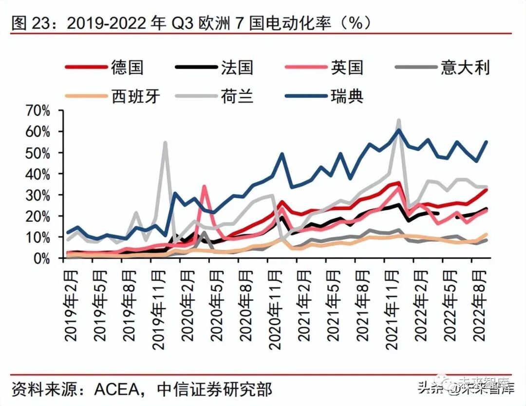 歐洲 2022 年前三季度電動車銷量達 164.3 萬輛,同比增加 7.2%。考慮到 2022 年歐 洲市場電動化趨勢持續提升,我們預計歐洲市場 2022-2023 年電動車銷量分別實現 209/243 萬輛,同比+10%/+16%,2022 年整體景氣度受到地緣政治影響明顯。