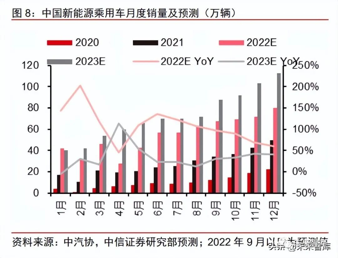 預計 2023 年新能源乘用車銷量將達到 870 萬輛。2022 年 1-9 月我國新能源乘用車銷 量 436 萬輛,同比+114%;我們預計 2022 年全年我國新能源乘用車銷量將達到 657 萬輛, 同比+97.8%,全年的新能源乘用車滲透率達到 27.2%,同比提升 11.7pcts。雖然補貼政策 退出在即,但優質供給的增加、補能網絡的完善仍是新能源車長期提高滲透率的核心動力, 新能源車的滲透率提升仍預計將持續向上。我們預計 2023 年全年新能源乘用車銷量將達 到 870 萬輛,同比+32.4%,2023 年新能源乘用車滲透率達到 36.8%,同比提升 9.6pcts。