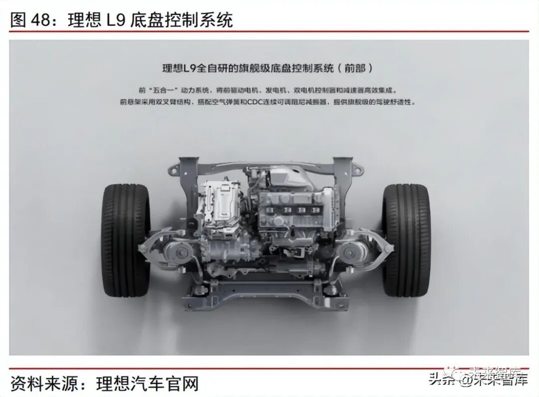 智能底盤:空氣懸架成為核心配置,底盤域控制器開始得到應用。過去空懸系統主要 配置于如奔馳、寶馬等豪華品牌的高端車型上,能夠顯著提升操控性、舒適性,標配車型 價格在 70 萬以上。隨著國內自主車企不斷推出高檔品牌,空氣懸架成為高端品牌增配的 主要產品之一,蔚來 ET7/ES7、小鵬 G9、理想 L8/L9 均搭載空氣懸架。另一方面,造車 新勢力開始借助底盤控制器,提升底盤智能化水平。其中,蔚來 ET7 首次采用了蔚來自研 的底盤域控制器,可以對懸架的舒適性、操控性和調節進行軟件設計和調校,向下可以下 降 10mm,向上可以升高 40mm。理想 L9 通過全自研的旗艦級底盤控制系統,配合標配的 CDC 連續可調阻尼減振器,可根據路面振動反饋毫秒級自動調節阻尼;其空氣彈簧可 在高速時自動將車身降低以節省能耗,并在停車時提供更便捷的上下車、裝卸行李的功能。
