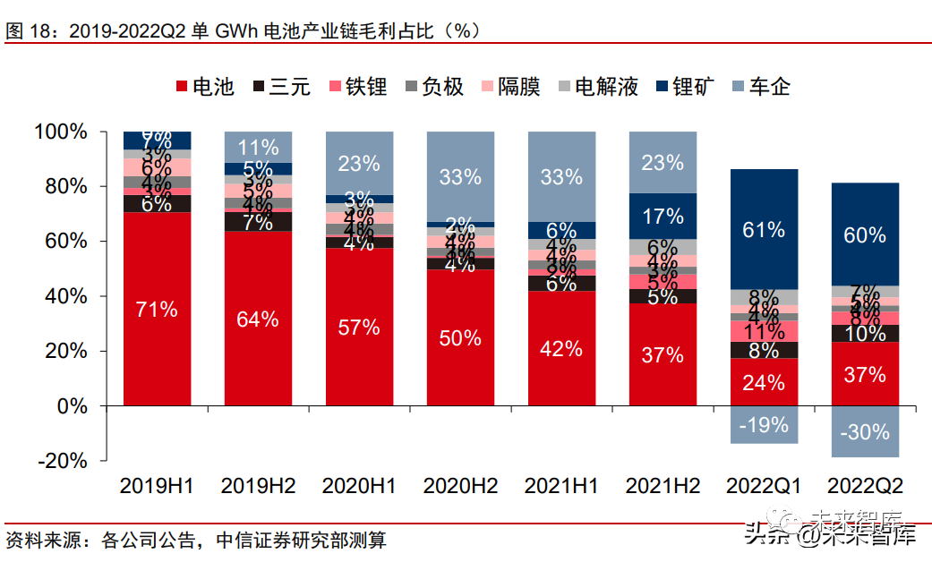 原材料價格繼續上行空間不大,產業鏈降本有望帶動下游電動車成本下降。2022 年 Q2 以來,動力電池產業鏈上游原材料價格企穩,主要原材料如碳酸鋰當前價格約 53 萬元 /噸,較 2022Q1 末 50.25 萬元/噸上漲僅 5%,六氟磷酸鋰當前價格 30.6 萬元/噸,較 2022Q1 末 47 萬元/噸下降 35%,預計后續原材料價格持續上行空間較小。我們測算 1GWh 動力 電池產業鏈毛利變化情況,2022 年 Q1 鋰資源環節毛利占比 61%,達歷史極值;Q2 占比 約 60%,較 Q1 環比下降約 1pct,電池環節毛利占比約 37%,較 Q1 提升約 13pcts。長 期來看,電動車的主要成本來源在于動力電池,而原材料價格有望進入下行周期,動力電 池盈利能力有望從 Q1 低點逐步修復,支撐對下游電動車的降本。