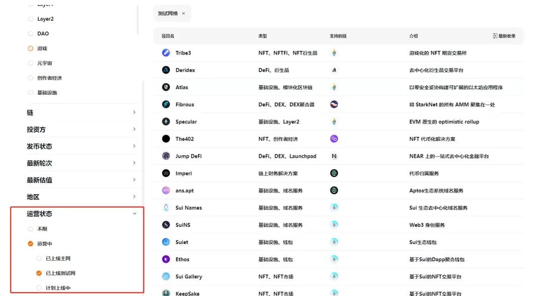 本文是 ChainCatcher 根據 Rootdata 整理的 100 個處于測試階段的加密項目,按照公鏈、基礎設施、DeFi、NFT、DAO、社交娛樂、游戲等多個賽道分類。此外,用戶也可以到 Rootdata 項目頁面查看詳細信息,利用過濾器功能(運營狀態--運營中--已上線測試網)即可輕松篩選出測試階段的項目。