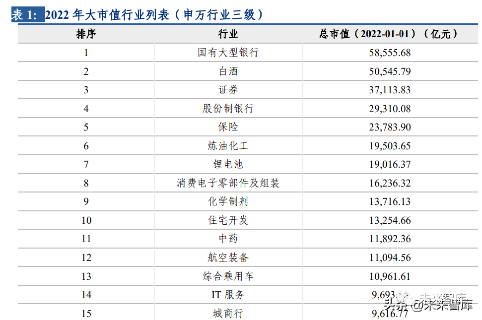 同理,我們選取了 2021 年全年收盤價與 PE 倍數,統計出各大市值行業的股價與 PE 漲跌 幅數據來展現 2021 年大市值行業的行情表現。