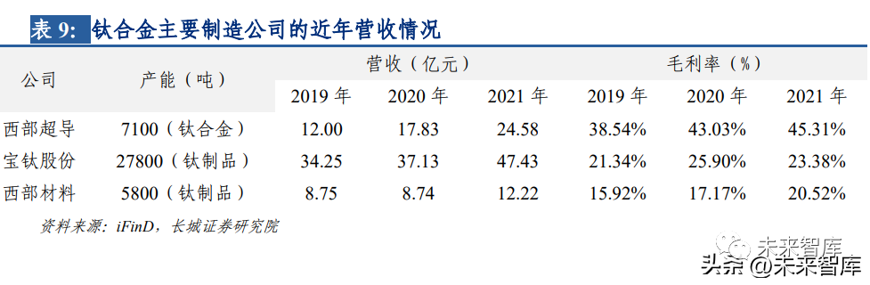 鈦行業在國民經濟發展中具有重要的地位,對國防、經濟及科技的發展具有戰略意義,是 支撐尖端科學技術進步的重要原材料產業,也是國民經濟發展和產業升級換代的基礎產 業。我國極為重視鈦行業的發展,2021 年,國內鈦行業市場整體向好,中低端產品市場 受益于 PTA、化工行業需求推動,同比呈現明顯增長態勢,高端產品市場受益于航空航 天等領域升級換代、國產化提升影響,需求旺盛,鈦行業市場延續穩定增長態勢,但同時 鈦行業市場高端產品產能不足,中低端產品競爭激烈、產品趨同化、同質化矛盾依然明 顯,供需結構繼續仍有待進一步改善。總體來看,未來鈦合金在航空發動機等航空航天領 域有較大的市場發展機遇。目前國內生產航空用鈦合金相關產品的企業主要有三家,分別為西部超導、寶鈦股份和 西部材料。整體來看,鈦合金制品業務近三年的營收和毛利率都有一定提升,主要受下游 行業需求上升推動。以寶鈦股份為例,公司是我國最大的以鈦及鈦合金為主的專業化稀 有金屬生產科研基地,主導產品鈦材年產量位居世界同類企業前列,2021 年公司實現鈦 產品銷售量為 2.66 萬噸。公司在國內市場處于領先地位,連續三屆獲得中國航天科技集 團優秀供應商,同時也是美國波音、法國空客、法國斯奈克瑪、美國古德里奇、加拿大龐 巴迪、英國羅爾斯-羅伊斯等公司的戰略合作伙伴,公司所在地寶雞被譽為“中國鈦城”、 “中國鈦谷”。公司擁有多項國際領先的具有自主知識產權的核心技術,研發實力雄厚,未 來產能提升空間較為廣闊。我們認為隨著鈦行業市場的航空發動機等高端產品需求持續增加,預計國內航空用鈦合金的相關制造企業或將通過提高產能來滿足市場需求,提升 自身業績。
