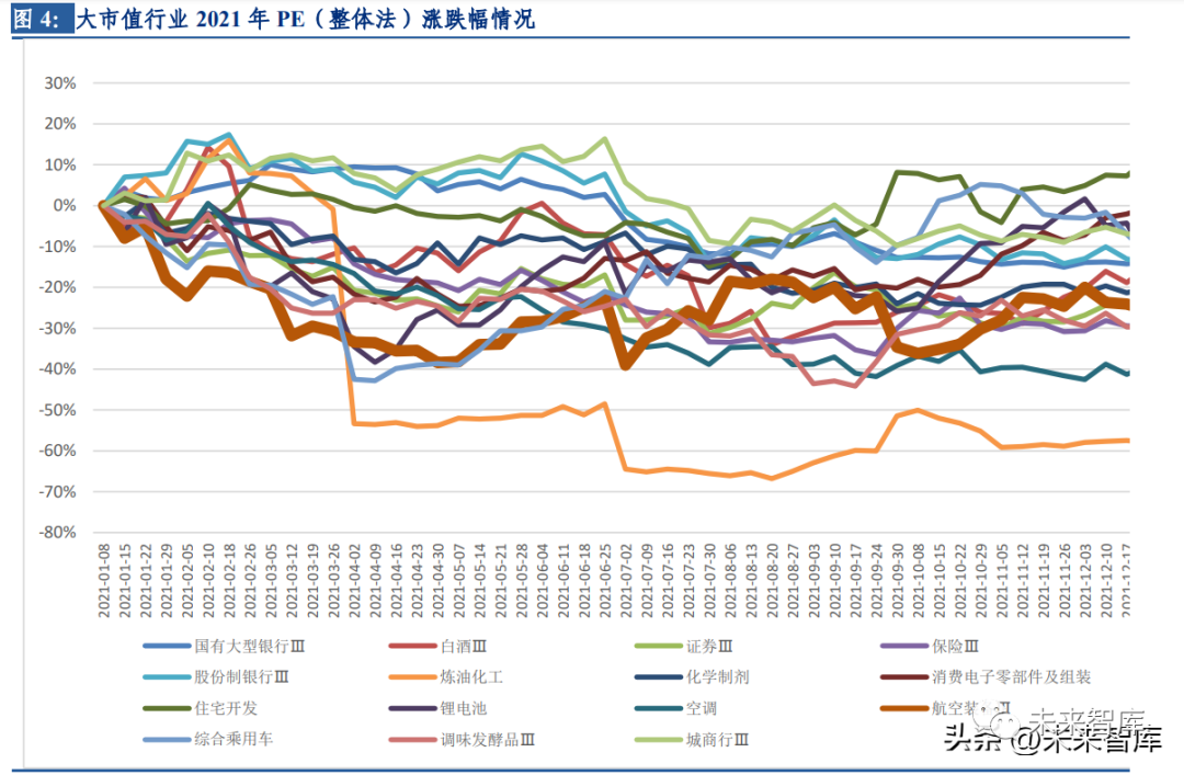 從 2021 年全年來看,15 個大市值行業中有 8 個行業的收益率為正,前三名分別為鋰電池 (58.94%)、航空裝備(12.99%)、綜合乘用車(6.55%),其中鋰電池收益率實現較高增 長;大多數行業的 PE 漲跌幅在 2021 年間保持穩定,位于水平坐標軸上下浮動。