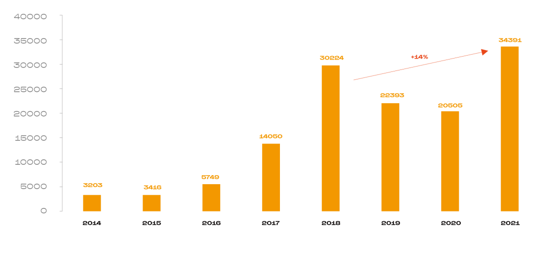 衡量指標是開發者數量。真正的建設者,就會真正動手去開發。據 Electric Capital 數據,Web3 每年新加入的開發者數量,從 2014 年的 3203 位增至 2021 年的 34391 位,漲了近十倍。盡管中途因監管趨嚴、幣值下跌有兩年的倒退,但總體趨勢是向上的。「無論周期如何波動,這是 Web3 行業唯一昂揚向上的指標。它不可能倒退。」汪天凡說。