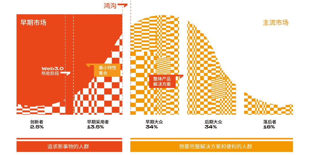 中金公司(CICC)基于「跨越鴻溝」理論提出,目前 Web3 正處于從「創新者」到「早期采用者」的跨越時期。前者是 Web3 的原始圈層,后者是第一批真正的 Web3 圈外用戶。而這個跨越時期的關鍵在于,「劃時代」級別單個重量級應用的出現。
