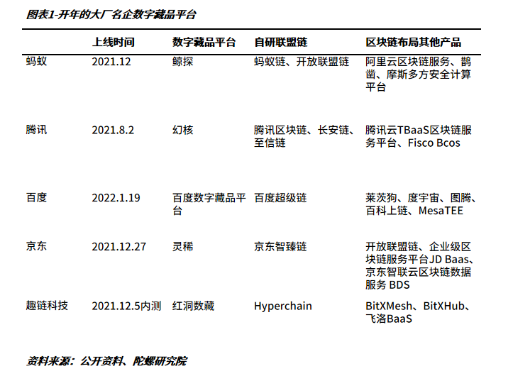 但對于當時的大多數大廠而言,數字藏品僅是基于現有市場補充作為產品矩陣的拓寬以構建引流新入口,例如京東、百度等多是在APP新增數字藏品入口,而非推出專用APP。而從基礎設施來看,數字藏品構建仍以螞蟻鏈、至信鏈等主流聯盟鏈為主,云服務與運營費用相對高昂。