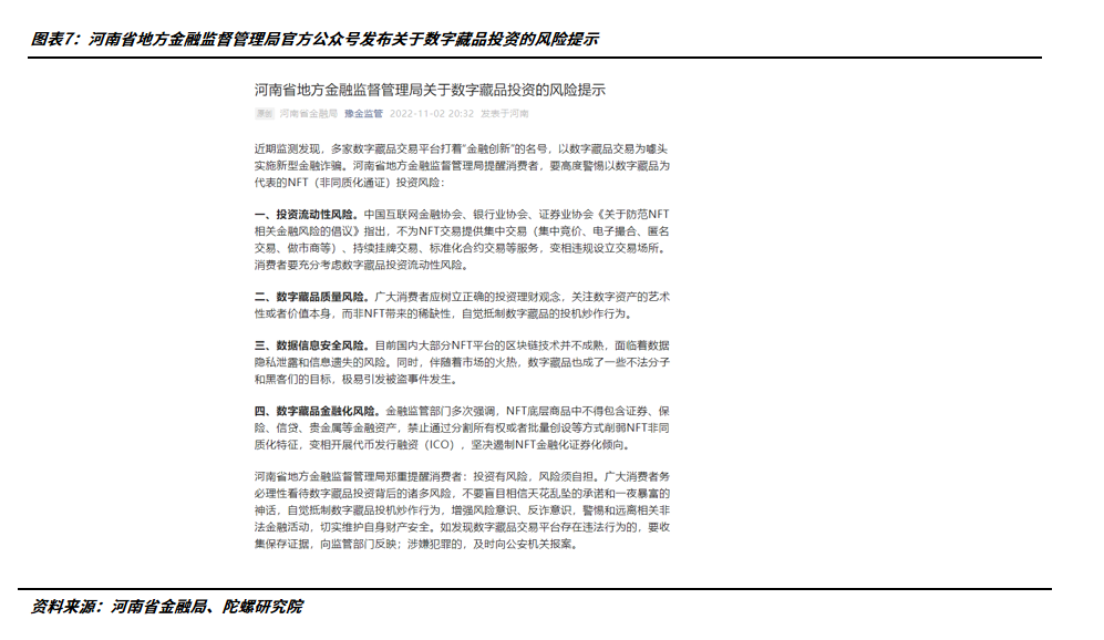 另一方面,國家級與地方級監管部門已然開始對數字藏品有所監測。繼國家版權局啟動《國家版權局等四部門啟動“劍網2022”專項行動》后,11 月 10 日,河南省地方金融監督管理局官方公眾號發布關于數字藏品投資的風險提示,提示指出近期監測發現,多家數字藏品交易平臺打著“金融創新”的名號,以數字藏品交易為噱頭實施新型金融詐騙,并提出要高度警惕以數字藏品為代表的NFT(非同質化通證)四大投資風險,包括流動性風險、質量風險、數字信息安全風險以及金融化風險。