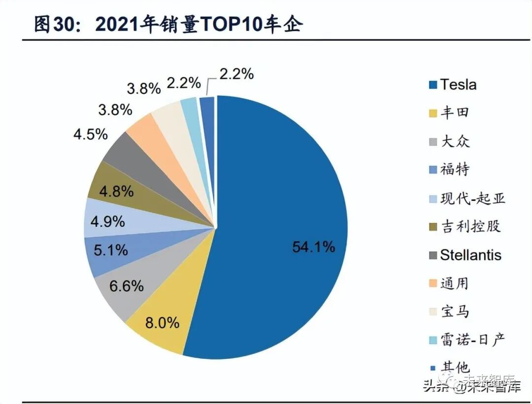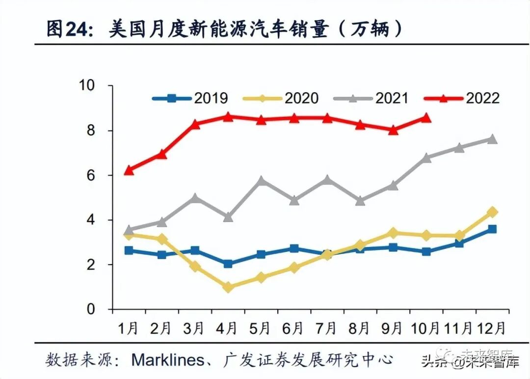 特斯拉本土擴產疊加國產化車型豐富推動巨大市場潛力釋放。據 Marklines, 2021 年美國新能源汽車銷量 68.1 萬輛,同比+105.3%,新能源汽車滲透率 4.4%,同比+2.2pct。2022 年 1~10 月新能源汽車銷量 80.7 萬輛,同比+60.4%, 新能源汽車滲透率增長至 7.0%。隨著拜登政府新一輪清潔能源減排以及電動化替 換政策,疊加或將落地的購買補貼政策與產品力擴張,美國市場電動化增長空間可 期。特斯拉引領,逐步孕育“一超多強”格局。特斯拉產能落地保障交付,2022 年 4 月德州奧斯汀工廠 Model Y 搭載 4680 大圓柱電芯正式投產;大眾 ID.4、奔馳 EQE、EQS 國產化落地強勢入局;新勢力 Rivian、福特突破產能瓶頸后有望推動 電動皮卡市場高增,預計 2023 年全美新能源汽車銷量有望超 200 萬輛。