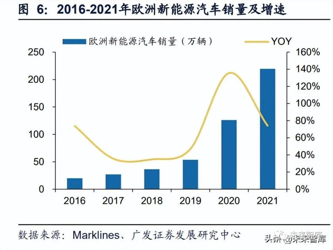 法規達標壓力趨弱同時俄烏戰爭導致供應鏈承壓,2022年歐洲新能源汽車滲 透率增速趨緩。類比中國市場,據中汽協,2020年中國新能源汽車銷量136.7萬 輛,同比增速僅為10.9%,主要系雙積分考核壓力較小、補貼大幅退坡疊加平價產 品稀缺,中國新能源汽車市場進入調整期。歐洲市場于2020年啟動全球最嚴碳排放 法規,在自下而上盈利擴張以及自上而下碳排放考核激勵下,2021年歐洲新能源汽 車市場迎來高景氣度。據Marklines,2021年歐洲新能源汽車總銷量219.7萬輛,同 比+74.1%,帶動新能源汽車滲透率提升至15.3%,同比+7.65pct。2022年1~10月 新能源汽車總銷量185.88萬輛,同比+8.7%,新能源汽車滲透率16.9%,同比 +2.8pct。受烏俄戰爭影響,歐洲供應鏈短期承壓,同時通脹加劇拖累汽車消費。