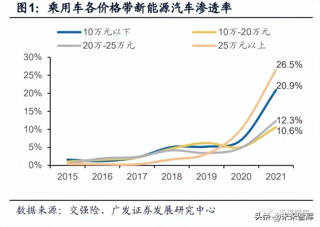 中國供應鏈平價技術全面落地加速全球輸出。A級車全面受益磷酸鐵鋰+CTP實 現技術平價,比亞迪率先全系車型換裝磷酸鐵鋰刀片電池,成本優勢顯著,2022年 推出更高集成CTB,引領A級車市場高增。作為平價技術的磷酸鐵鋰體系,探索草酸 亞鐵工藝、M3P等工藝突破,正在加速覆蓋A級和A0級車型。根據交強險數據測算, 22年8月中國市場10~20萬主力價格帶的乘用車滲透率已提升至23.9%,相較于21年 提升13.3pct;而10萬元以下價格帶的乘用車滲透率已提升至35.2%,相較于21年提 升14.3pct。中國供應鏈圍繞材料體系、電池結構、整車制造引領電動車技術創新趨 勢,新一輪車型周期帶動格局演變加速,驅動海外份額超預期擴張。