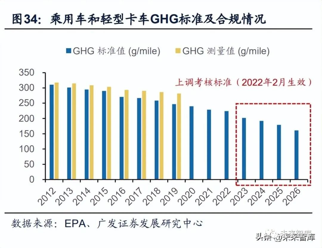 (3)提升 2023-2026 年 GHG 氣體排放考核標準。當前美國采用 CAFE 體系 (燃油經濟性)與 GHG 體系(碳排放指標)分別對車輛動力系統的經濟性及車輛 運行時對環境的影響進行監管。2021 年 12 月美國國家環境保護局(EPA)發布新版 GHG 標準,調整了 2023~2026 年車型年的 GHG 排放要求,相比此前的 SAFE 規則,考核要求持續提升。按照最新規則,從 2022 車型年到 2023 車型年,GHG 排放加嚴約 10%,2024 車型年進一步加嚴了 5%,2025 和 2026 車型年則分別在 上一年的基礎上加嚴 6.6.%和 10%。最終美國輕型車(乘用車和輕型貨車)的綜合 平均 CO2 排放當量在 2026 年的對應值約為 161 g/mile。