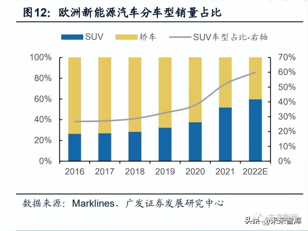 下一階段碳排放法規考核趨嚴帶來中長期電動化的確定性。2021年7月歐盟正 式提出《Fit for 55》法案,強有力的碳排政策有望平抑部分國家補貼退坡壓力。據 歐盟理事會官網,2022年10月27日歐盟理事會和歐洲議會就新車和貨車更嚴格的 二氧化碳排放性能標準達成了臨時政治協議共識:中期即到2030年,新車及貨車的 二氧化碳排放較2021年分別降低55%和50%;長期即到2035年,歐盟銷售新車實 現二氧化碳零排放,即禁售燃油車。2025年將開啟下一階段碳排放考核,車企開 發的全新平臺有望釋放更多面向中國供應鏈的訂單機會。