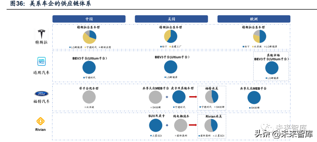 材料產業鏈受益景氣需求率先受益,電池企業降本增效驅動需求迅速成長。鋰 電池材料企業深耕布局,短期內有望率先受益,如當升科技-SK創新、中偉股份/天 賜材料-特斯拉、道氏技術-浦項化學-LG新能源均已實現本土車企及日韓電池企業 供應鏈滲透。中國企業憑借磷酸鐵鋰+CTP平價技術率先筑就競爭力,受益于中國 市場的正向反饋有望加速向美國供應鏈拓展,提升中國企業全球份額。寧德時代以 平價技術創新加快全球技術輸出,根據寧德時代官微,寧德時代宣布與福特汽車建 立全球戰略合作關系,合作內容涵蓋在中國、歐洲和北美的動力電池供應。根據協 議,從2023年起,寧德時代將為北美的福特Mustang Mach-E車型供應磷酸鐵鋰電 池包,并從2024年初起, 為北美福特純電皮卡F-150 Lightning提供磷酸鐵鋰電池 包。據福特中國信息中心,福特集團計劃于2023年將電動車產能提升至60萬輛, 于2026年超200萬輛,并于2030年在全球建立起240GWh的生產能力,巨大的擴產 需求有望為寧德時代帶來新的營收增長和市占率的提升。總體而言,美國正在從政 策、資本、市場、供應鏈等方面追趕中國和歐洲的電動化進程,以建立鋰電池產業 鏈自主制造能力的途徑加大對本土動力電池產業扶持。但受制于當前本土鋰電環節 薄弱,高景氣需求下中國供應鏈依靠成本及先發優勢有望充分抓取訂單機遇。