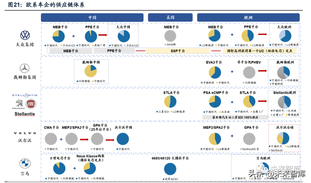 供給彈性逐步釋放,中國產業鏈驅動下一輪平價周期。當前以大眾、 Stellantis、特斯拉、戴姆勒為代表的歐美車企均自建電池工廠,謀求掌握電池生產 能力。自建產能有望于 2024 年后集中放量,給 2025 年后的動力電池競爭格局帶來更多不確定性。另一方面,車企遠期新平臺規劃處于醞釀中,將逐步釋放訂單吸 引全球電池企業競相角逐。新一輪定點預計于 2022 年后密集開啟,影響 2025 年 后競爭格局。第一輪電池供應鏈重組受益于軟包式微、方型崛起,磷酸鐵鋰、高電 壓三元、CTP 等加成下寧德時代快速突破歐洲市場,未來三年市占率有望不斷創新 高,據 6 月 28 日《新能源汽車系列之十一:動力電池迎來第二輪全球格局重 組》,我們測算 2025 年前寧德時代全球市占率有望單邊上升至 38%,歐洲市占率 有望增長至 42.1%。第二輪重組中新的電池結構(如 46 系大圓柱、麒麟電池)及 材料體系(超高鎳、磷酸錳鐵鋰、M3P)將成為重要創新,提升中國電池企業獲取 全球車企訂單的競爭力,如億緯鋰能布局 46 系大圓柱把握寶馬、特斯拉技術應用 趨勢,匈牙利工廠正穩步推進;國軒高科攜大眾打造本土電池公司 PowerCo,獲 得第一個 UC 項目定點爭取 2025 年后的 SSP 平臺。