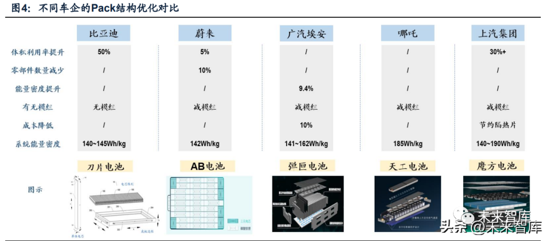 其他車企持續優化電池結構。(1)蔚來:推出 75kWh 三元及磷酸鐵鋰混用電 池包,系統能量密度 140Wh/kg。三元電池可以提高能量密度,彌補磷酸鐵鋰電池 低溫性能短板,而磷酸鐵鋰電池則可以發揮其低成本、高溫穩定性等優勢。(2)哪 吒:推出天工電池,率先搭載新車型哪吒 S,系統能量密度為 185Wh/kg,純電動 版 CLTC 工況下續航里程可達 715km。(3)廣汽埃安:自研彈匣電池兼顧長續航 與安全性,主力車型埃安 Y 采用彈匣電池工藝,體積能量密度提升 9.4%,重量能 量密度提升 5.7%,成本下降 10%。(4)上汽集團:推出標準化電池包-魔方電池, 電池包長寬固定(1690mm*1300mm),設計 110mm、125mm、137mm 三種不同 高度,覆蓋 44~150kWh 容量,適配 A0~D 級車型。電芯躺式布局大幅提升電池包 空間利用率同時節省隔熱材料,系統能量密度可達 180Wh/kg。