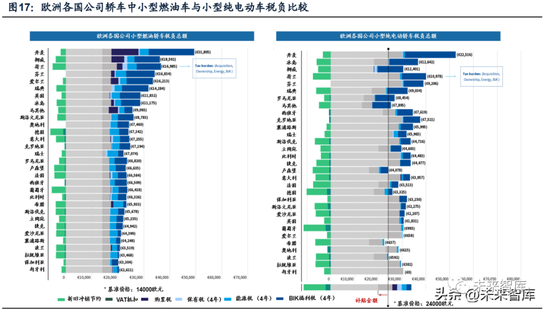 稅負優勢有望持續激活新能源汽車長期消費潛力。稅收制度通過調整私人及公 司車的相對價格來改變汽車的消費購買行為。歐洲各國汽車稅種設置呈現多樣性, 主要包括車輛購置稅、車輛所有權稅及能源消費稅。針對公司車輛,設置 BIK 福利 稅、VAT 抵扣稅及折舊沖銷稅。根據 T&E 對于歐洲 31 國同級別車型在不同國家的 稅負總額進行比較,系統考量包含購置及置換補貼在內的財稅政策對汽車消費的稅負影響。整體來看,對于小型燃油轎車,能源稅為主要征收稅種,保有 10 年的私 人汽車稅負總額在 1500 歐元~17000 歐元之間;對于小型燃油 SUV,稅負總額在 2800 歐元~51400 歐元之間。具體來看,小型燃油轎車中丹麥(1.69 萬歐元)、 荷蘭(1.23 萬歐元)及挪威(1.20 萬歐元)稅負最重,保加利亞(1512 歐元)、 西班牙(2862 歐元)稅負最輕。對于同樣保有 10 年的小型私人新能源轎車,瑞士 (4117 歐元)、挪威(3636 歐元)及德國(2710 歐元)為稅負總額 TOP3,但 相比燃油車消費者稅收負擔更輕,分別降低 4203 歐元,8358 歐元及 3189 歐元;匈牙利及保加利亞均為 0 稅收,新能源汽車稅負最低。總成本來看私人新能源轎車 普遍高于同級燃油轎車,德國受益于稅負優勢兩者總成本較為接近。