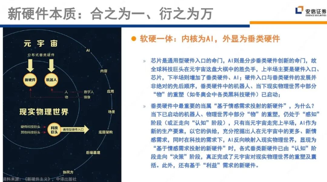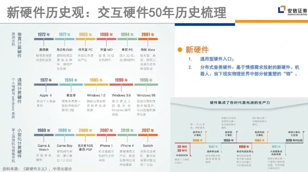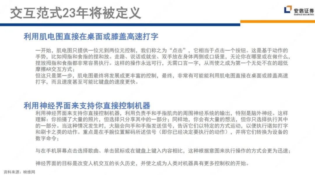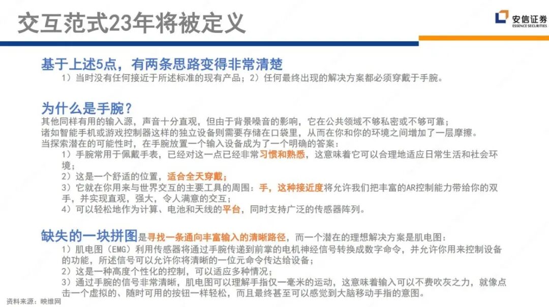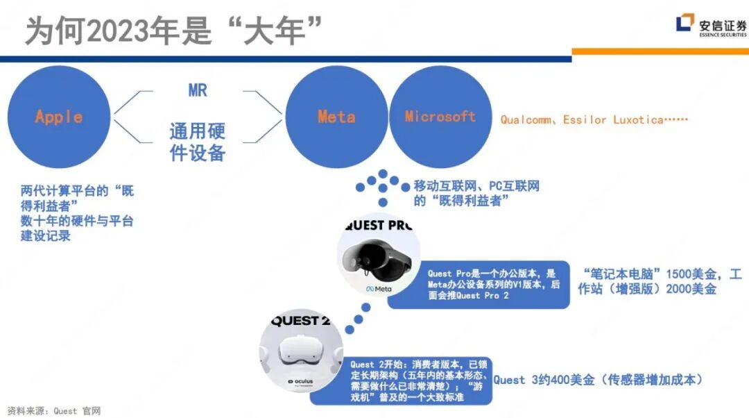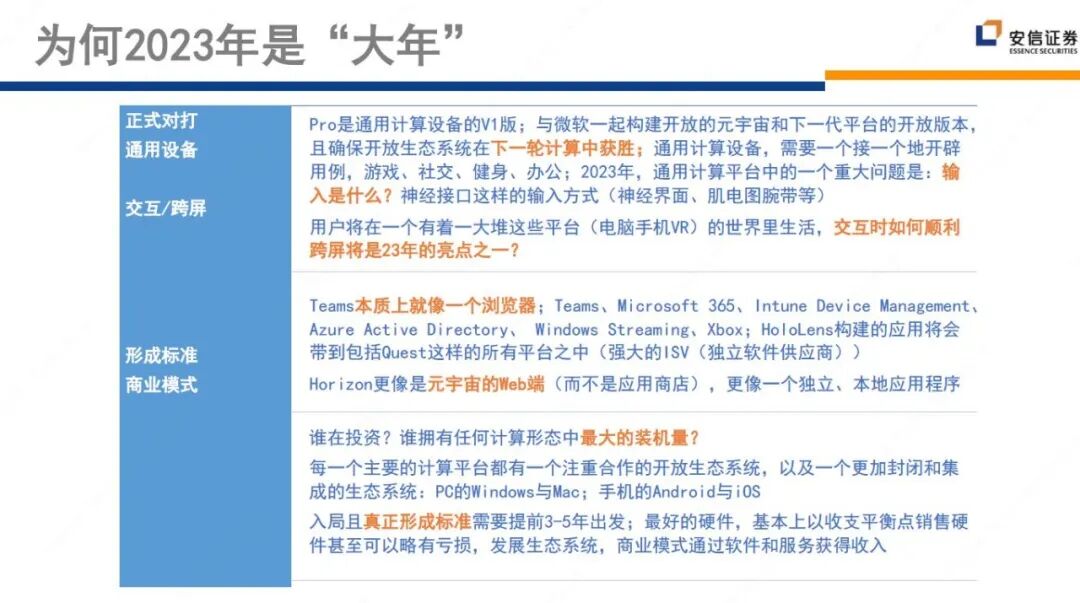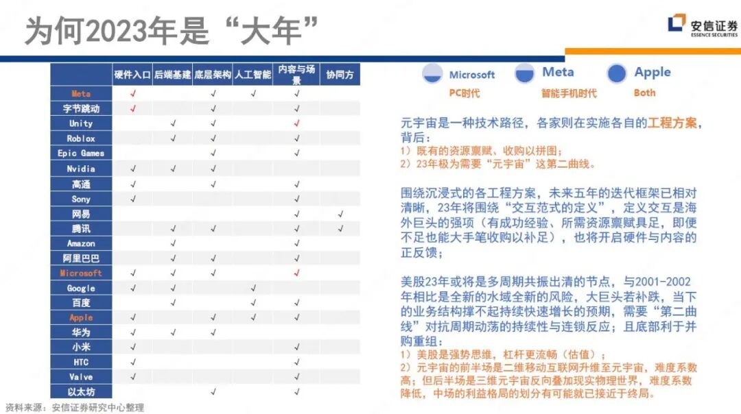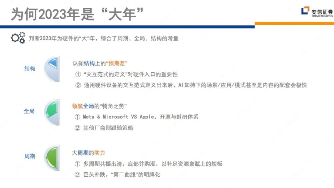我們非常期待2023年!2023年有可能是“預期差”最大的一年,我們認為它將是“硬件的大年”,“硬件”是指MR,即通用硬件設備,“大”年,則是綜合考慮了“周期、全局、結構”。之所以會導致“預期差”最大,是市場尚未認知到“交互范式的定義”對硬件入口的重要性,此外,市場也尚未意識到,與硬件配套的軟件部分,借力于AI的應用/場景/模式甚至是內容的創新(AIGC)速度極快,這是認知結構層面的“預期差”;META&MICROSOFT與APPLE,通用硬件設備的開源&封閉系統之爭,犄角之勢將領航2023年的全局;2023年又是多周期共振出清的節點,市值的底部有望迎來的并購潮、巨頭市值下跌將加速其對“第二曲線”的“打出明牌”,是大周期輪動給2023年的大助力。