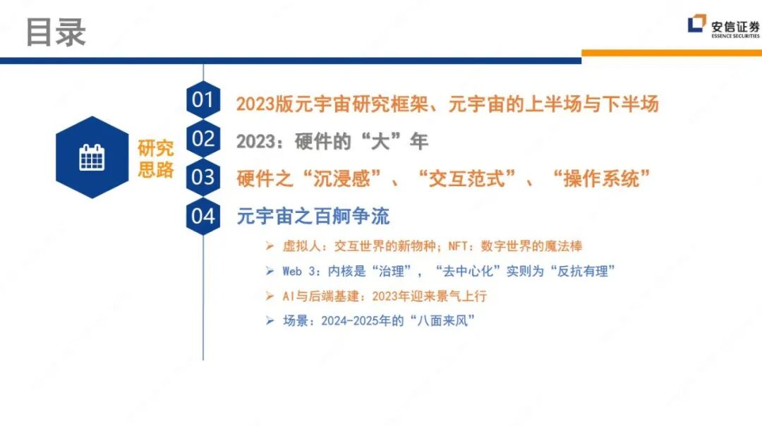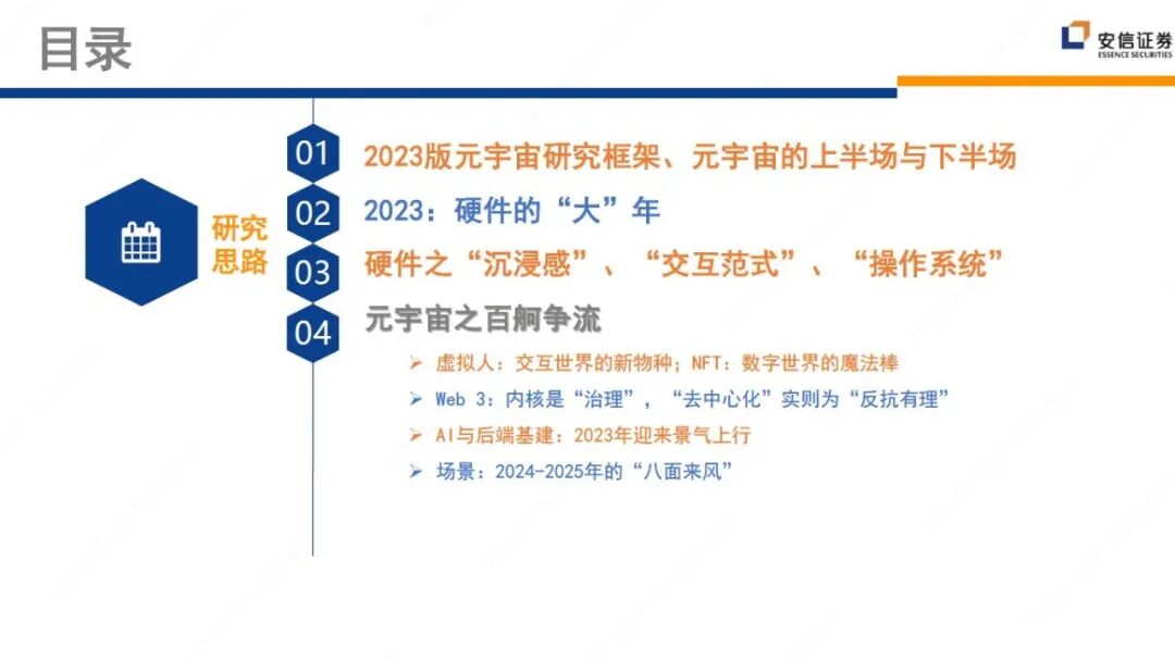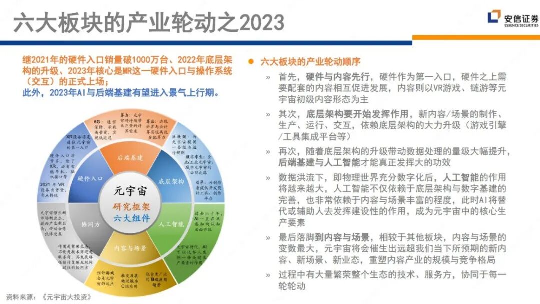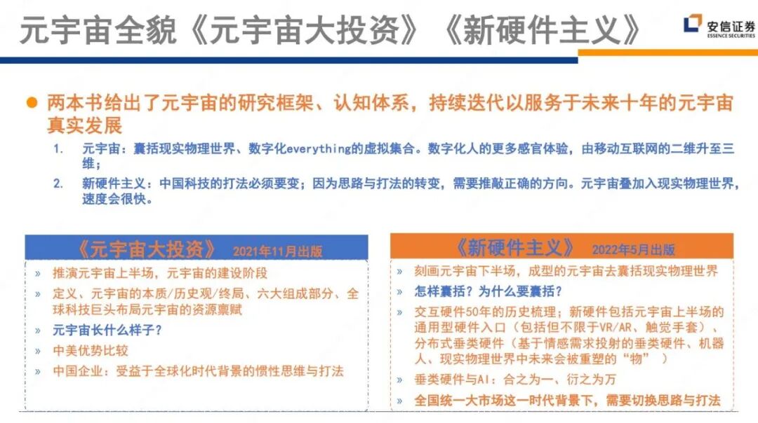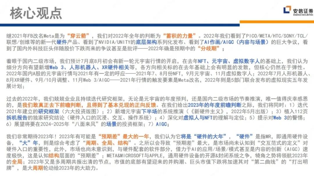 過去的2022年,我們兢兢業業且持續迭代研究框架,無論是元宇宙的年度預判,還是國內二級市場的節奏推演,唯一值得慶幸感恩的,是我們敢真正去下前瞻判斷,且得到了基本兌現的正向反饋。在我們給出2023年的年度前瞻判斷之際,我們將同時:1)迭代2021年建立的研究框架(六大投資版圖);2)新增元宇宙下半場的系統推演(《新硬件主義》,2022年5月出版);3)植入112頁拆機報告的獨家研究結論(硬件入口的沉浸、交互、操作系統);4)深化對虛擬人與NFT的理解與定位;5)提示對Web 3的警惕;6)展望將要在2024-2025年“八面來風”的場景的投資框架;7)AIGC;