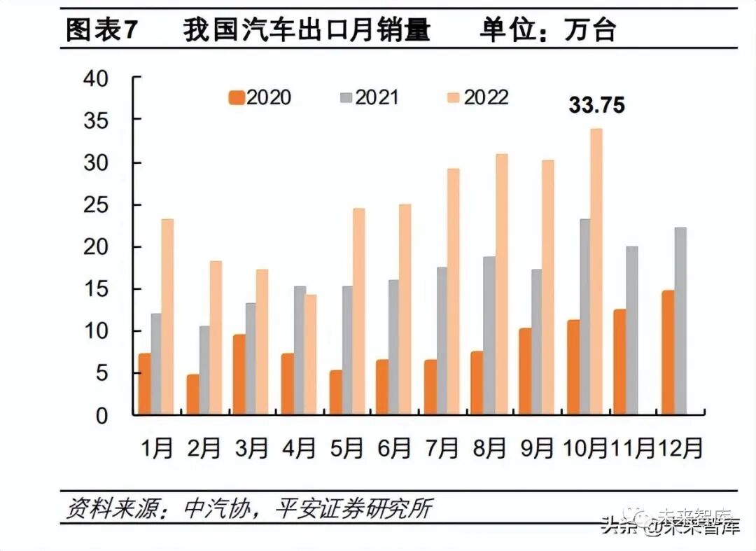 汽車出口成為拉動我國汽車銷量的又一增長極。據中汽協數據,2022 年 1-10 月我國汽車出口銷量達到 245.4 萬臺,同比增 長 55.3%,其中 2022 年 1-10 月乘用車出口銷量達到 197.4 萬臺,同比增加58.5%。