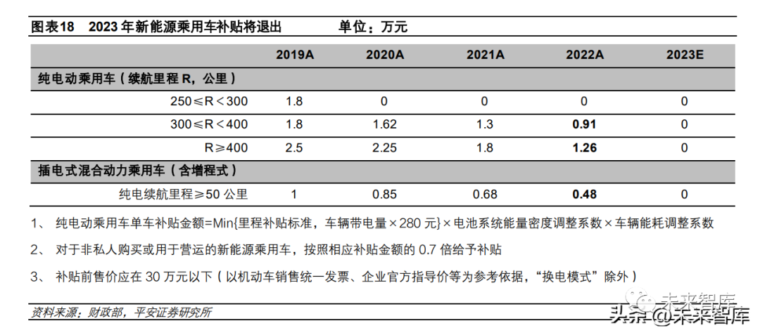 2023 年新能源汽車購置補貼退出考驗純電車的成本消化能力。此次退坡額度相比以往更大,以 30 萬元以內續航里程超過 400 公里的純電車為例,2023 年補貼退坡金額達到 1.26 萬元,而 2020~2022 年其補貼退坡金額分別為 0.25 萬/0.45 萬/0.54 萬元,相較于純電車型,插電式混動車退坡幅度相對溫和,為 0.48 萬元,但同樣高于往年退坡額度。對主打 30 萬元以下新 能源車的車企而言,補貼退坡將導致新能源車企盈利壓力加大。為應對補貼退坡帶來的盈利壓力,部分車企已經宣布漲價, 如比亞迪近期宣布對旗下車型上調售價 2000~6000 元不等,但考慮到特斯拉近期降價的措施,我們認為大部分車企漲價會 比較謹慎,需在盈利與銷量之間做好平衡,最終補貼退坡的成本不會完全傳導至消費者端,因此我們認為在動力電池價格高 企,國家補貼退出的情況下,2023 年車企純電動車的盈利壓力依然較大。