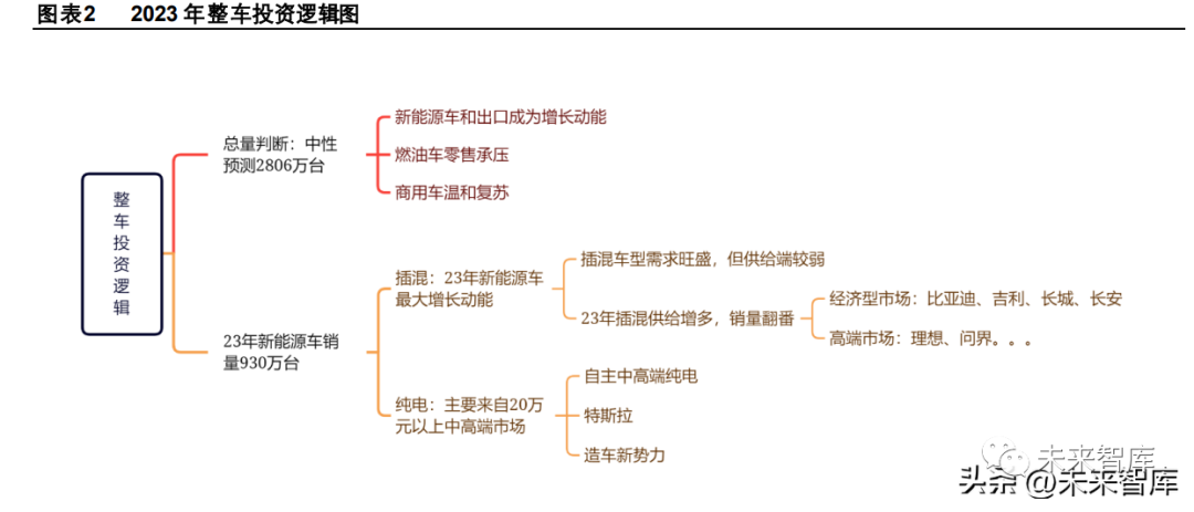 市場期待燃油車購置稅減免政策延續。目前市場內對 2023 年購置稅政策主要有三種預期假設:一是減免政策完全退出,2023 年燃油乘用車購置稅稅率恢復到 10%;二是購置稅減免政策延續,繼續維持 5%的購置稅稅率;三是購置稅減免政策逐步退 出,2023 年購置稅稅率為 7.5%。汽車消費作為國民經濟的重要支柱之一,我們認為在當前經濟環境下不排除燃油車購置稅 減半政策延續的可能性。預計 2023年汽車銷量同比增長 1.5%至 2806 萬臺。假設 2023 年 30 萬元以下燃油車購置稅稅率提高到 7.5%,基于此我們 預計 2023 年國內乘用車批發銷量為 2450 萬臺,同比增長約 0.82%,其中新能源乘用車銷量有望達到 905 萬臺,同比增長 39.2%。2022 年我國乘用車出口銷量有望達到 250~260 萬臺,預計 2023 年乘用車出口有望達到 350~360 萬臺左右。如果 剔除新能源車和出口的增長拉動,國內燃油車的零售銷量將繼續下滑。2023 年商用車市場在經歷一年多的低迷期后有望迎 來溫和復蘇,我們預計 2023 年商用車銷量為 356 萬臺,同比增加 6.2%。