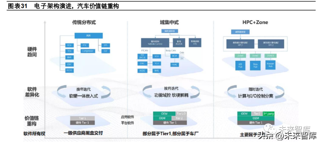 1、分布式架構階段:主機廠為硬件集成者,Tier1 把上游的 Tier2(嵌入式軟件、芯片)打包后提供給主機廠。2、功能域架構階段,類似功能合并,軟件逐步從過去的黑盒中分離,主機廠選擇直接與原來的 Tier1/2 合作,在應用軟 件層可能選擇合作也可能選擇自研。主機廠根據能力不同對域控制器的軟硬件部分參與程度不一。對于自研程度深的主 機廠,域控制器供應商相當于純代工角色,對于自研程度淺的主機廠來說,域控制器供應商提供“交鑰匙”服務 3、進入中央計算+區域控制階段,大部分 ECU 消失,各傳感器/執行器被中央計算單元支配,原屬于 Tier1 的大部分策 略層的軟件由主機廠主導,主機廠對軟件中的高價值模塊的介入程度漸深,因此主機廠必須要有專業的軟件團隊,以集 成自研與外包軟件,軟件所有權主要屬于汽車制造商。