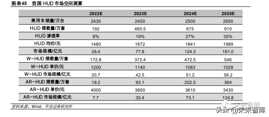 座艙域控制器為座艙的控制中心,圍繞座艙域控制器,將呈現日益豐富的座艙生態,我們看好抬頭顯、智能座椅/內飾/車燈、 高附加值汽車玻璃等細分領域。車企提供更好座艙交互體驗的訴求成為 HUD 增長的重要催化,AR-HUD 有望成為未來 HUD 的主流。HUD 的應用場景將更 加豐富,當前的 AR-HUD 主要作為 ADAS 人機交互的窗口,可呈現虛實結合的架勢輔助信息,使駕駛員擁有更佳的應用體 驗。隨著AR-HUD 本身技術的進步(更遠投影距離和更大視場角)和無人駕駛技術的進步,未來的 AR-HUD 有較大的想象 空間,整個風擋玻璃可成為交互載體,提供游戲、觀影等娛樂。據高工智能汽車數據,2021 年中國市場乘用車新車搭載 HUD 上險量為 116.72萬臺,前裝標配搭載率僅 5.72%,我們認為 HUD 滲透率有望持續提升,到 2025 年我國 HUD 前裝配套量產規模將達 910 萬套,HUD 滲透率將達到35%左右。