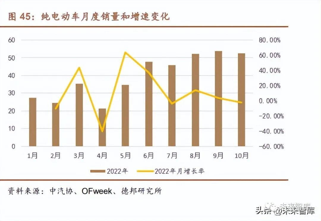 中國新能源車銷量居世界首位。在政策和市場的雙重驅動下,新能源汽車銷 量及滲透率穩步提升,根據中汽協數據,2022 年 10 月,國內新能源汽車產銷分 別達到 76.2 萬輛和 71.4 萬輛,同比增長分別為 87.6%和 81.7%。分車型來看,10 月國內純電動車月度銷量為 52.6 萬輛,與上年同期相比,增長率為 66.6%,仍延 續高增長勢頭。