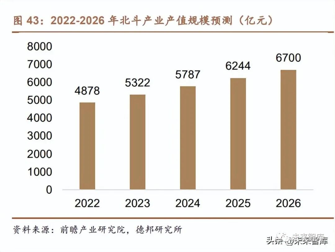 北斗導航軍用民用兩開花,下游產值增長迅速。自從北斗在 2012 年開始投 入區域服務以來,我國的衛星導航與位置服務產業以北斗為核心推動力突破了五 大市場領域:汽車前裝市場,智能手機市場,高精度專業市場,國際化市場以及 與其他技術與產業的融合市場。我國衛星導航與位置服務產業平均每年以超過 20% 的年增長率快速占有市場。根據中國衛星導航定位協會披露數據, 2021 年我國 衛星導航與位置服務產業總體產值達到 4690 億元人民幣,較 2020 年增長16.29%。其中,包括與衛星導航技術研發和應用直接相關的芯片、器件、算法、軟件、導 航數據、終端設備、基礎設施等在內的產業核心產值同比增長約 12.28%,達到 1454 億元人民幣,在總體產值中占比為 31%,增速高于去年。2021 年產業鏈各 環節產值也較 2020 年均有提升,隨著“北斗+”和“+北斗”生態范疇的日益擴 大,下游產值逐漸擴大達到 2218 億元,同比增長 18.04%,在總體產值占比為 47.29%,在產業鏈中占比最大。根據前瞻產業研究院的預測,到 2026 年,我國 北斗產業的產值規模將增長到 6700 億元。