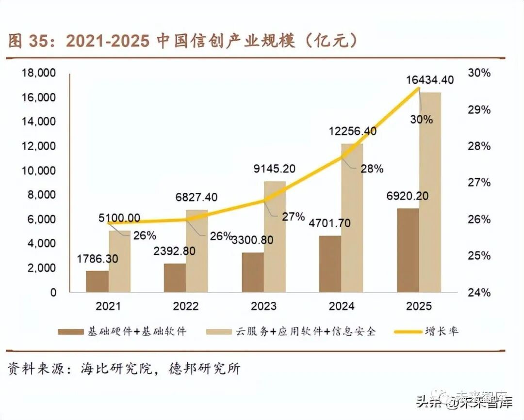 軟硬件協同發展,信創生態初步建立。信創產業的產業鏈可以被分為五個大 類,分別是基礎硬件、基礎軟件、云服務、應用軟件、以及信息安全。從信創生 態構成來看,基礎硬件由芯片、云計算、服務器三大產品構成,是信創的核心底 層;操作系統、數據庫和中間件構成了基礎軟件的核心產品;云服務、應用軟件 和信息安全環節聚集行業先進廠商,拓寬產業鏈應用生態。整體信創生態體系構 建的關鍵是上下游產品兼容適配,軟硬件協同發展,產業鏈全體創新,形成信息 技術的國產化自主可控。數據顯示,2022 年基礎硬件+基礎軟件的市場規模為 2392.8 億元,占比 26.0%,云服務+應用軟件+信息安全的市場規模為 6827.4 億 元,占比 74.0%。未來,市場結構將繼續細微調整,逐漸向 3:7 靠攏。2022 年信 創產業總規模達到了 9220.2 億元,近五年復合增長率為 35.7%,預計 2025 年突 破 2 萬億。