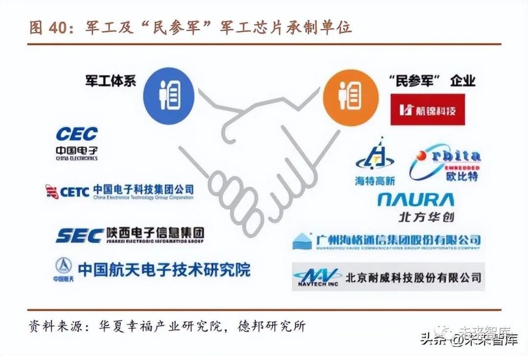 軍工芯片產業鏈市場化低,軍民融合先發優勢明顯。以美國為首的西方國家, 一直對我國實行嚴格的軍用級芯片材料禁運措施。華夏幸福產業研究院的報告指 出,我國早已在軍用芯片領域進行了全產業鏈布局。目前自主率已經處于相當高 的水平,核心軍工芯片已經能夠實現自給自足。但與民用芯片相比,軍工芯片在 知識產權、研發實力、生態體系和利潤效益等方面還存在諸多困難和瓶頸,軍民 融合成為軍工芯片市場的發展趨勢。例如,中國電科 14 所牽頭聯合清華大學、龍 芯中科等單位研發的華睿 1 號芯片填補了國產 DSP 領域的空白。其他“民參軍” 企業還有海思半導體、耐威科技、紫光國芯、海特高新、中興微電子等,與軍工 電子科研院所和企業等在芯片領域深度合作,軍民融合推動軍工芯片和民用芯片 互相反哺,構建芯片共同體,完善產業鏈條。