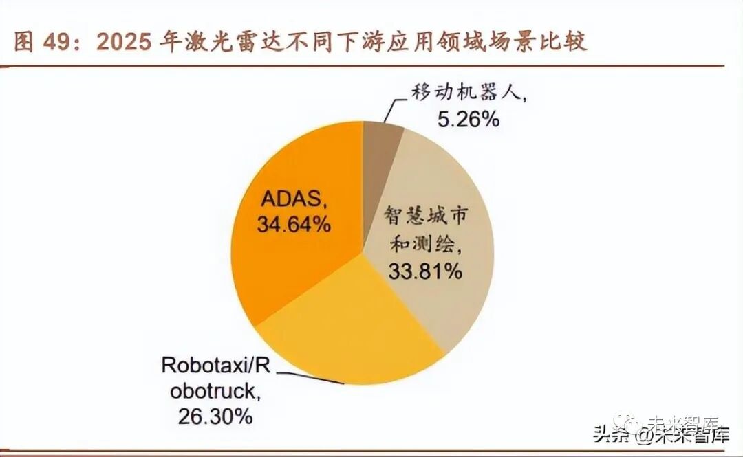 激光雷達市場規模空間廣闊,高級輔助駕駛(ADAS)及無人駕駛將成為主要 應用領域。根據 Frost&Sullivan 預計,2025 年全球市場規模預計達到 135 億美 元,中國市場規模預計達到 43 億美元。激光雷達在下游高級輔助駕駛及無人駕駛 應用中滲透率將逐步增加,預計 2025 年占比將分別達到激光雷達市場規模的 34.64%和 26.3%,其余的占比主要包括智能城市、測繪、移動機器人等。