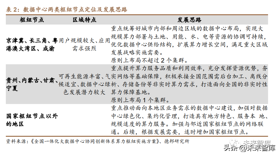 繼 2021 年底,寧夏、內蒙古、貴州、甘肅四地被批復啟動建設全國一體化 算力網絡國家樞紐節點之后,2022 年 2 月,發改委等部門同意粵港澳大灣區、成 渝地區、長三角地區、京津冀地區啟動建設全國一體化算力網絡國家樞紐節點, 涵蓋 8 個樞紐節點 10 個數據中心集群的“東數西算”工程正式啟動。