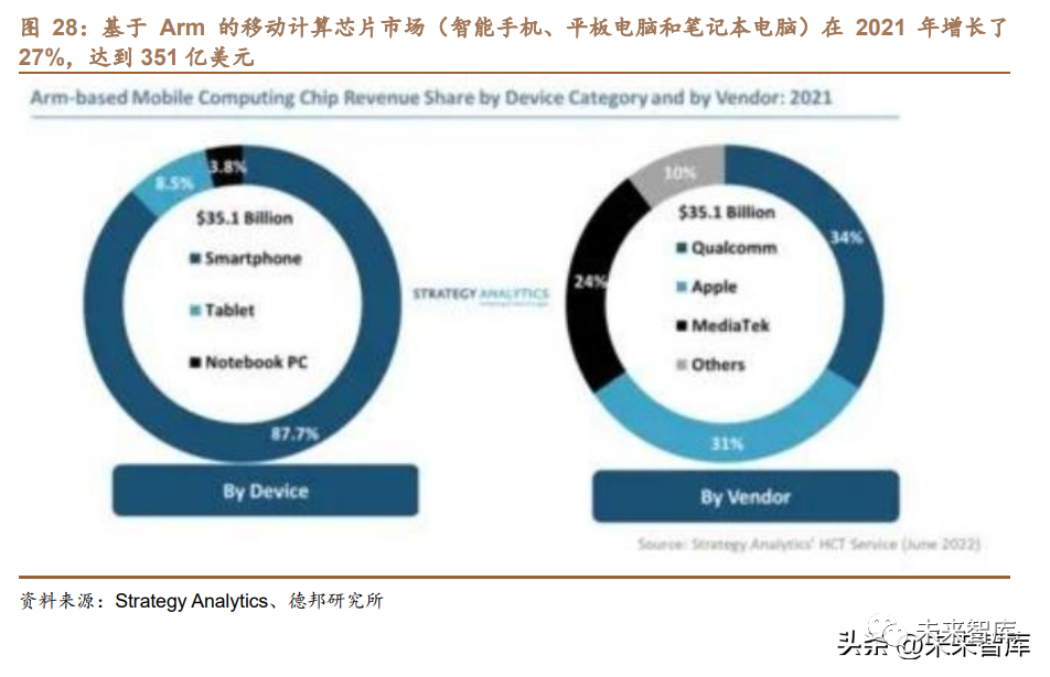 在移動設備領域方面,Arm 結構擁有領先的的行業市場和科技地位:根據 Arm 公司在 2019 年 Q1 的財報表示,目前 Arm 約有 90%的手機和 IoT 市場占有 率,總發貨量 1500 億。而依托巨大的市場發展空間,目前芯片設備領域方面的 新工藝、新制程和材料都將最先在 Arm 結構上得到應用。伴隨企業云端化步伐的 深入,向數據平臺布局 Arm 結構客戶端服務器是大勢所趨,首先大量采用 Arm 結 構的終端服務在企業數據平臺的同構,能夠提供應用研發、部署與運營上的無縫 合作,從而大幅度降低了開發者的工作復雜性,然后,新技術架構能夠提供基于 低負載的最高性價比的基礎設施,包括亞馬遜公司推出基于 Arm CPU 的云端服 務,以及微軟公有云在大數據處理、云存儲以及搜索引擎管理領域大量使用的 Arm 客戶端服務器等。市場研究公司 Canalys 總裁表示,Arm 預計到 2026 年或將占據 30%的 PC 市場,以及 50%的云服務器市場。Arm 已經占據大部分 PC 市場。根據 IDC 的數 據,幾乎 100%的蘋果產品中使用到 M 系列 SoC,在 2022 年第三季度,M 系列 SoC 占據了 13.5%的 PC 市場。根據 Omdia 的數據,Arm SoC 在 2022 年第二季 度占據了大約 7.1%的服務器市場。