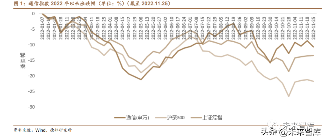 TMT(通信、電子、計算機、傳媒)行業橫向比較,通信行業 PE 從年初排 名第二的 38.6 倍下降到截止 2022 年 11 月 25 日的第四位 25.25 倍,同年初下降 34.59%,市值提升潛力巨大。截止 2022 年 11 月 25 日,電子行業 PE 29.68 倍、 計算機行業 PE 49.41 倍、傳媒行業 PE 30.09 倍。
