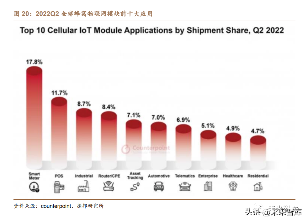 蜂窩模組下游應用廣泛。根據芯智訊,從應用端來看,2022 年二季度全球蜂 窩物聯網模塊的前五大應用分別是:智能電表、POS、工業、路由器/CPE 和資 產跟蹤,這些應用需求占據了整個蜂窩物聯網模塊市場的一半以上份額。與上一 季度相比,路由器/ CPE 和住宅市場出現了顯著改善。2022 年第二季度中國汽車 行業的表現差強人意,汽車連接市場并未展現出太大的吸引力。