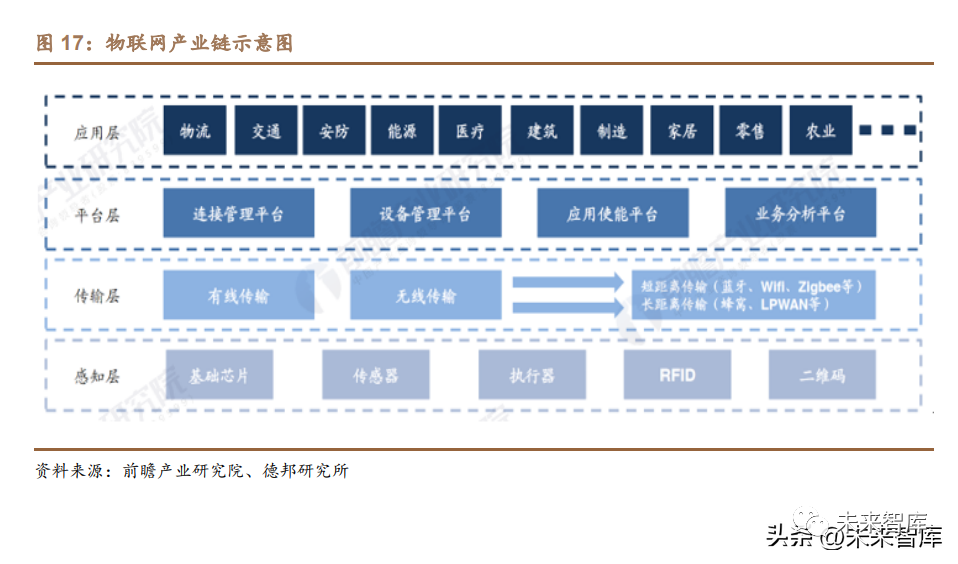 物聯網(Internet of Things,IOT),又稱傳感網,指的是將各種信息傳感設備, 如射頻識別(RFID)裝置、紅外感應器、全球定位系統、激光掃描器等種種裝置與 互聯網連接起來并形成一個可以實現智能化識別和可管理的網絡。根據前瞻產業研究院,早期的物聯網是指依托射頻識別技術的物流網絡,隨 著技術和應用的發展,物聯網的內涵已經發生了較大的變化。現階段,物聯網是 指在物理世界的實體中部署具有一定感知能力、計算能力和執行能力的各種信息 傳感設備,通過網絡設施實現信息傳輸、協同和處理,從而實現廣域或大范圍的 人與物、物與物之間信息交換需求的互聯。物聯網依托多種信息獲取技術,包括 傳感器、射頻識別(RFID)、二維碼、多媒體采集技術等。物聯網的幾個關鍵環節 可以歸納為“感知、傳輸、處理”。物聯網行業產業鏈剖析:共有四大層面。從產業鏈條來看,物聯網的產業鏈 條由上而下可以分為感知層、傳輸層、平臺層和應用層四個層級。