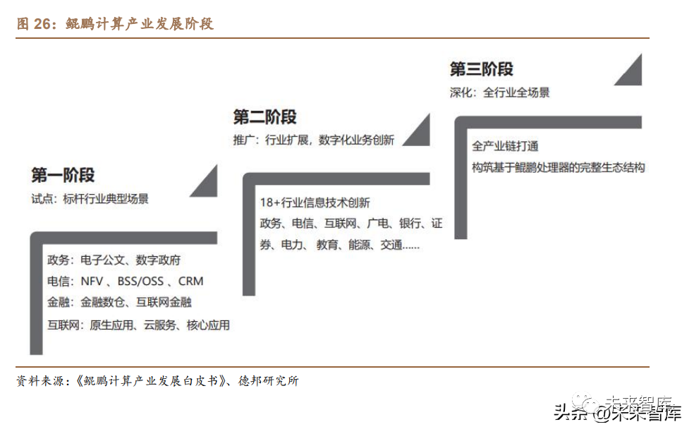 根據《鯤鵬計算產業發展白皮書》,鯤鵬產業鏈將分為三個階段,來完成建立 全行業、全場景的鯤鵬計算產業系統,以實現鯤鵬計算行業系統從關鍵產業試點 到全產業、全場景產業鏈的建設目標。讓整個產業鏈的上下游企業都能共享投資 紅利,從而達到從開發者、生產商、使用者再到科研院所等各方共贏,讓鯤鵬生 態成為開發者與終端用戶的共同選擇。1)試點階段:通過在政務、電信、金融和互聯網等行業選取典型場景進行產 業使能、孵化和試點,通過試點建立產業界上下游廠家和用戶的信心。2)推廣階段:面向政務、電信、互聯網、廣電、金融證券、電力、能源、交 通等行業全面打通產業體系,為行業數字化業務創新提供基礎。3)深化階段:面向全行業、全場景,打通產業鏈,構筑基于鯤鵬處理器的產 業體系。
