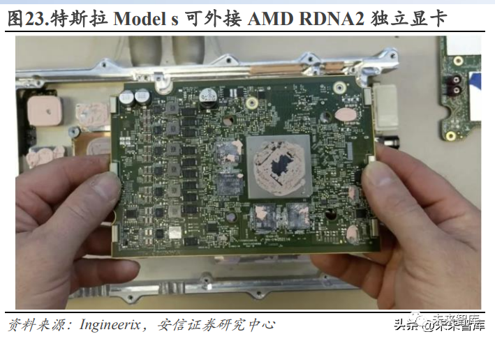 (2)AMD 發力高端座艙領域,2023 年末將攜手億咖通在國內首次實現座艙平臺量產:Intel 與 AMD 為桌面芯片兩大巨頭,雖 AMD 尚未公開發布車規級芯片,Intel 也自 A3920 以后停止迭代,但我們認為隨著座艙智能化繼續演進,對主控 SoC 性能要求繼續提升, 桌面級芯片廠商亦有望憑借高性能優勢博得一席之地。特斯拉作為智能化先驅率先應用 桌面芯片可為我們提供借鑒,其第三代車載信息娛樂系統 MCU 3.0 采用了 AMD 的桌面 級處理器方案,CPU 采用 Ryzen V1000 的定制版本,通過外掛獨立 GPU Navi23 可實現 高達 10 TFLOPS(10000 GFLOPS)的 GPU 算力,達到堪比臺式機的性能,并可支持 AAA 級游戲大作,為目前量產車型中頭部性能車機。目前,國內知名 Tier1 億咖通科技 已官宣與 AMD 達成戰略合作,雙方公司將協力打造面向下一代電動汽車(EV)的車載 計算平臺,預計于 2023 年末面向全球市場量產。