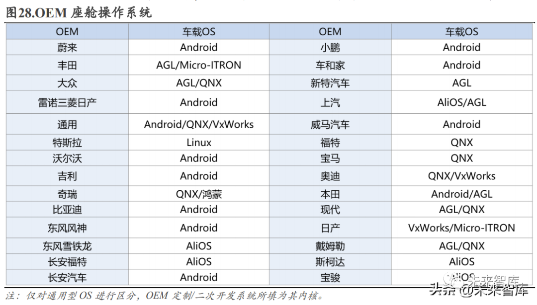其中,底層操作系統多被用于二次開 發或消費者無法直接交互感知的領域,因此其自身并不具備品牌效應;而應用操作系統則以 市場產品化為目的和檢驗標準,具備一定的品牌溢價,大多數廠商是基于 Linux 內核裁剪和 配置,然后加上自己設計的 UI 而成。整體來看,以上兩種對車載操作系統的定義相互交叉, 面向整車廠的實時性操作系統包括 QNX、RT-Linux、VxWorks 等;面向整車廠的非實時性操 作系統主要為 Android、AGL 等。面向消費者的實時性操作系統包括特斯拉 Version、百度 Apollo、華為鴻蒙 OS 等;而面向消費者的非實時性操作系統則包括小鵬 Xmart.OS、阿里 Ali.OS 等。