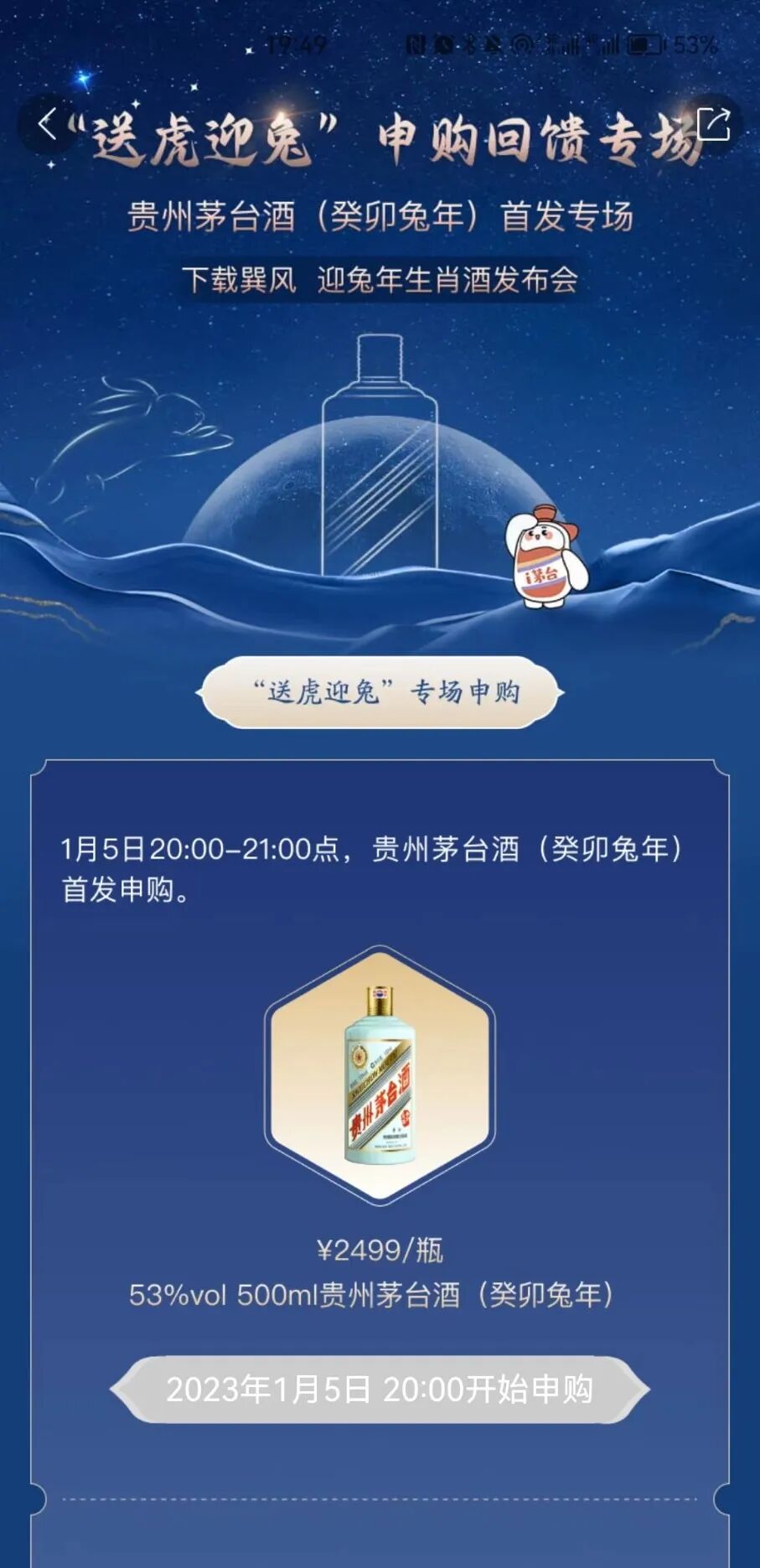 去年二季度開始,每天在“i茅臺”上銷售的虎年茅臺均在萬瓶左右,這樣的放量對市場的沖擊十分顯著。據了解,消費者同樣可于1月6日起在“i茅臺”每日申購兔茅。