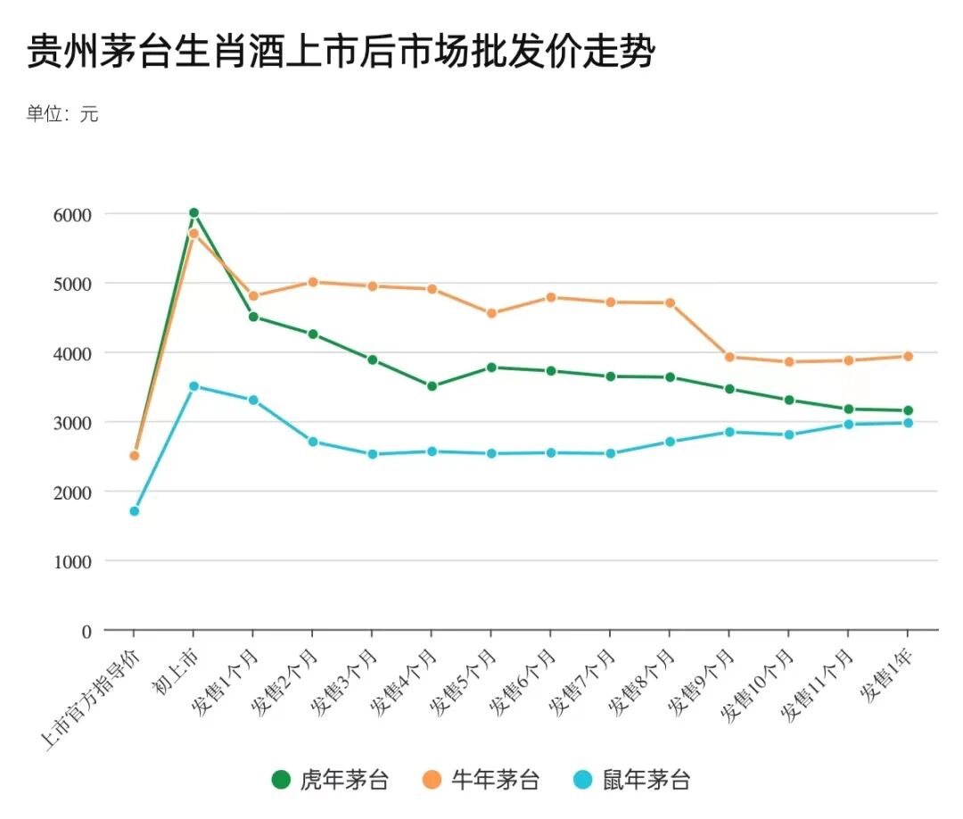 酒類直供平臺百酒匯執行董事李進軍告訴《每日經濟新聞》記者:“生肖酒推出就開始漲是一個共識,但最近幾年隨著茅臺生肖酒每年的放量,生肖酒推出不久就開始跌了,我認為兔年生肖酒也會先漲后跌,趨勢未變。”