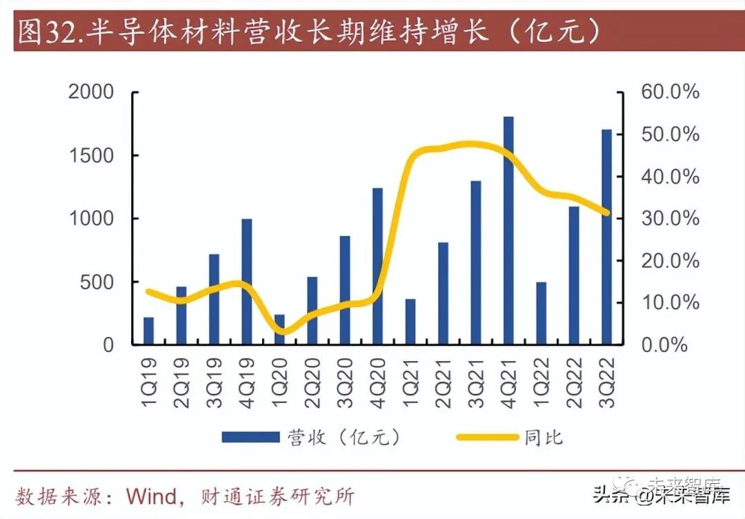 半導體材料 2022 年前三季度業績高速增長。A 股半導體材料領域前三季度市場 需求持續保持高景氣,實現營收 1705.40 億元,同比增長 31.34%,實現歸母凈 利潤 195.39 億元,同比增長 50.19%。隨著國內下游晶圓廠的持續擴建,半導體 材料的采購需求將實現持續增長。隨著美國 BIS 新規催化,國外半導體材料大廠 也出現逐步斷供國內晶圓廠半導體材料的趨勢,包括類似硅片、特種氣體、CMP、 光刻膠、掩膜版等半導體材料的國產替代需求極為迫切。