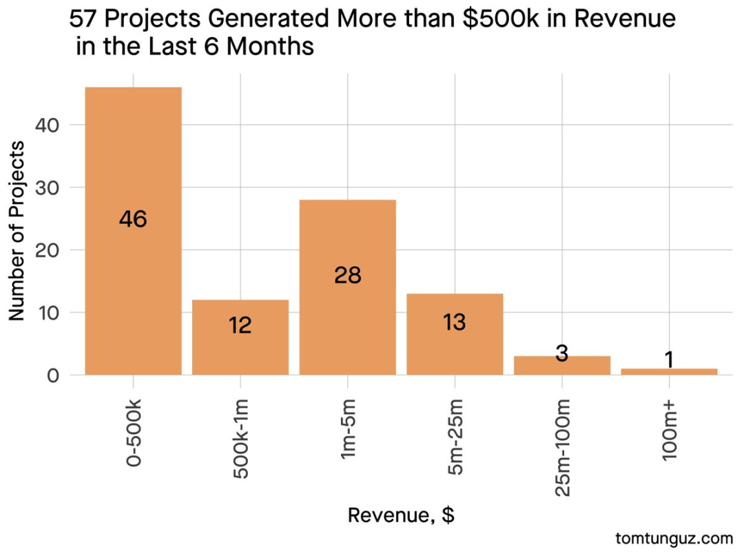 1 月 3 日,紅點創投知名風險投資家 Tomasz Tunguz 發文表示,在過去 6 個月,103 家 Web3 公司在鏈上產生了收入,其中 44% 的產值低于 50 萬美元,41 家公司在 500 到 2500 萬美元之間,最大的以太坊產生了 4.01 億美元。