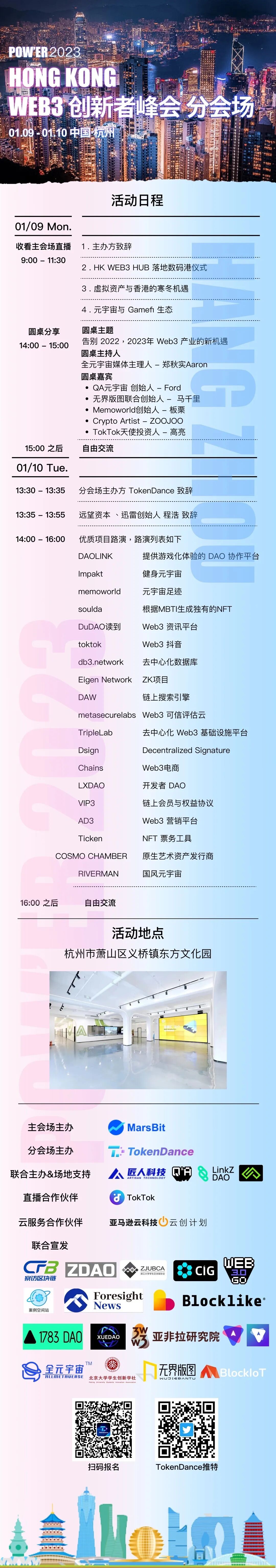 1月9-10日,《POW’ER 2023 香港 Web3 創新者峰會》即將舉辦,同步將啟動杭州場分會場,本次香港主會場邀請到包括香港財政司司長、王峰、孫宇晨、孔建平等嘉賓的干貨分享。