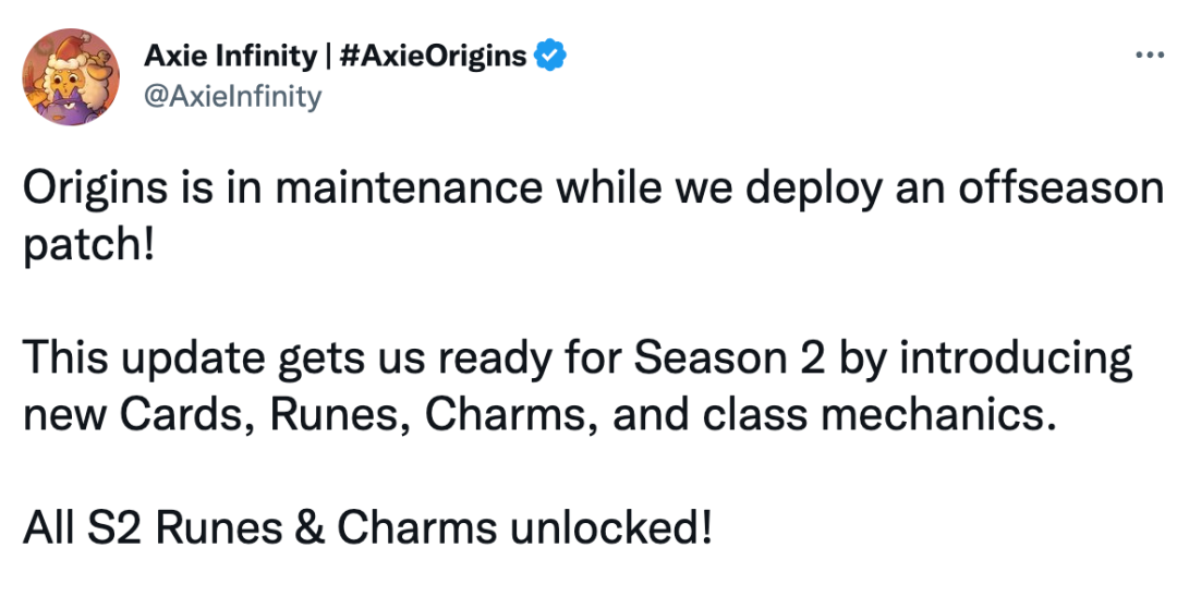 12 月 29 日,NFT 游戲 Axie Infinity 正在維護 Origins,目前正在部署休賽期補丁,本次更新通過引入新的卡牌、符文、護身符和職業機制,從而為 Origins Season 2 做好準備,所有的 Season 2 符文和護身符已解鎖。
